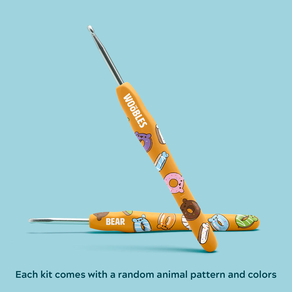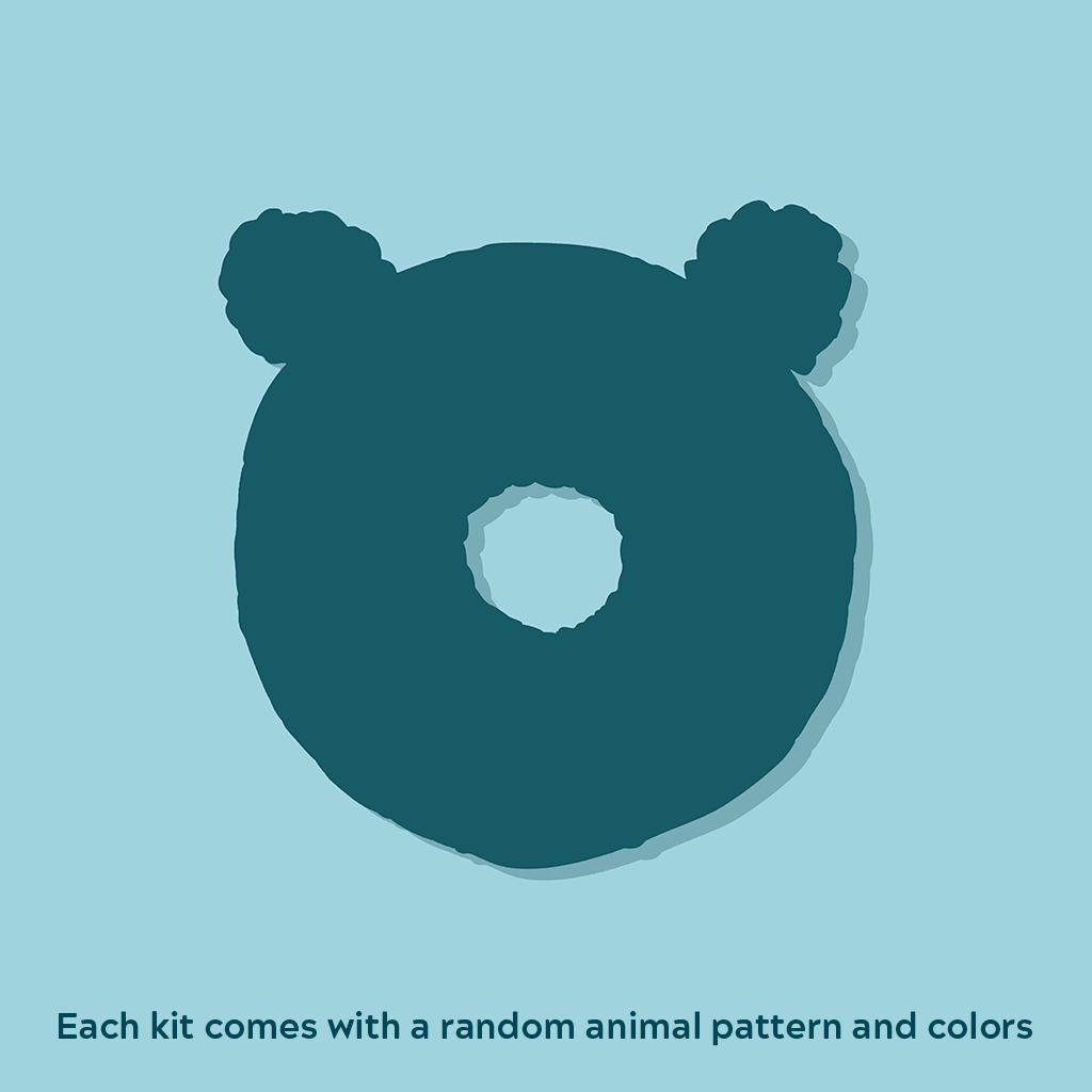 Each kit comes with a random custom hook, pattern, and colors to make one full-sized animal mystery donut.