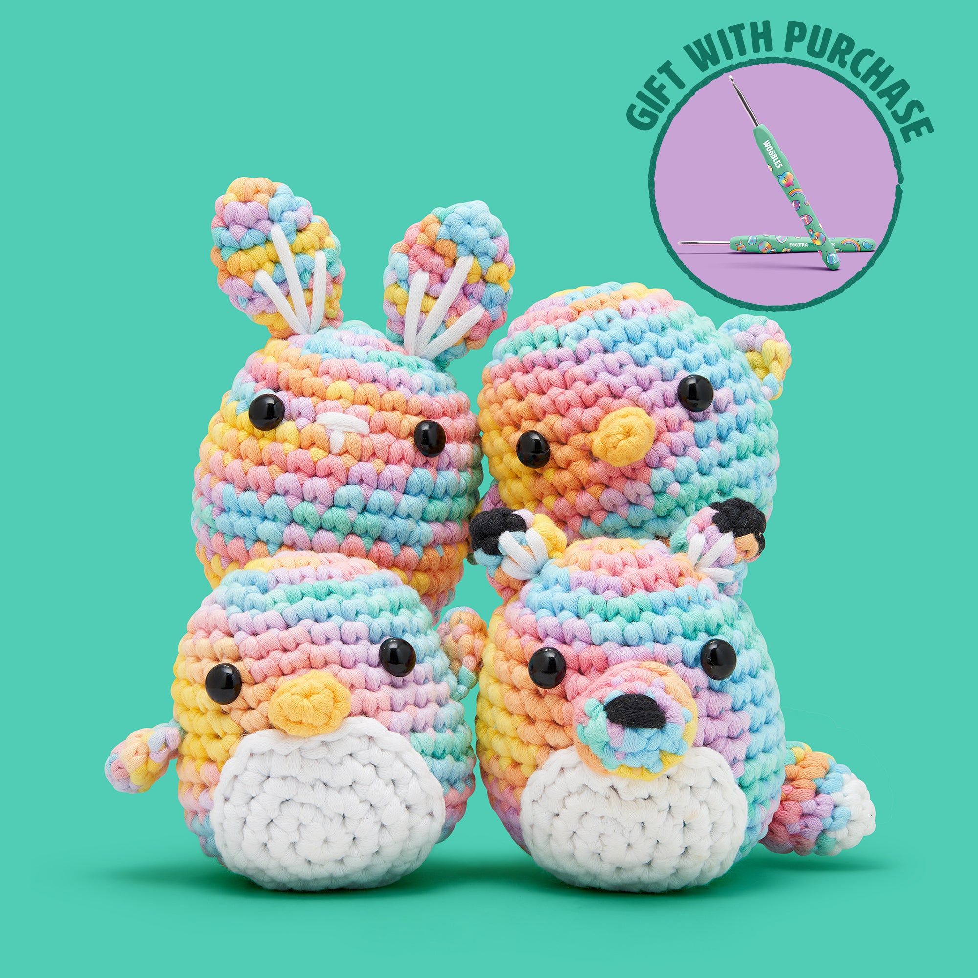 Featuring four of our simplest Woobles—Pierre the Penguin, Jojo the Bunny, Kiki the Chick, and Felix the Fox—this Easy Peasy Soft ’n’ Dreamy Bundle was designed with total beginners in mind. Of course our Easy Peasy Yarn™ makes it a snap to avoid snarls and snags, while our super simple videos guide you through every step of the way. Yet with their Soft ’n’ Dreamy new look, these penguin-credible pals are just as much fun for wooblin’ veterans to bring to life. So whatever your level, go ahead and grab your hook, ’cause you’re in for a rainbow-lievable time!